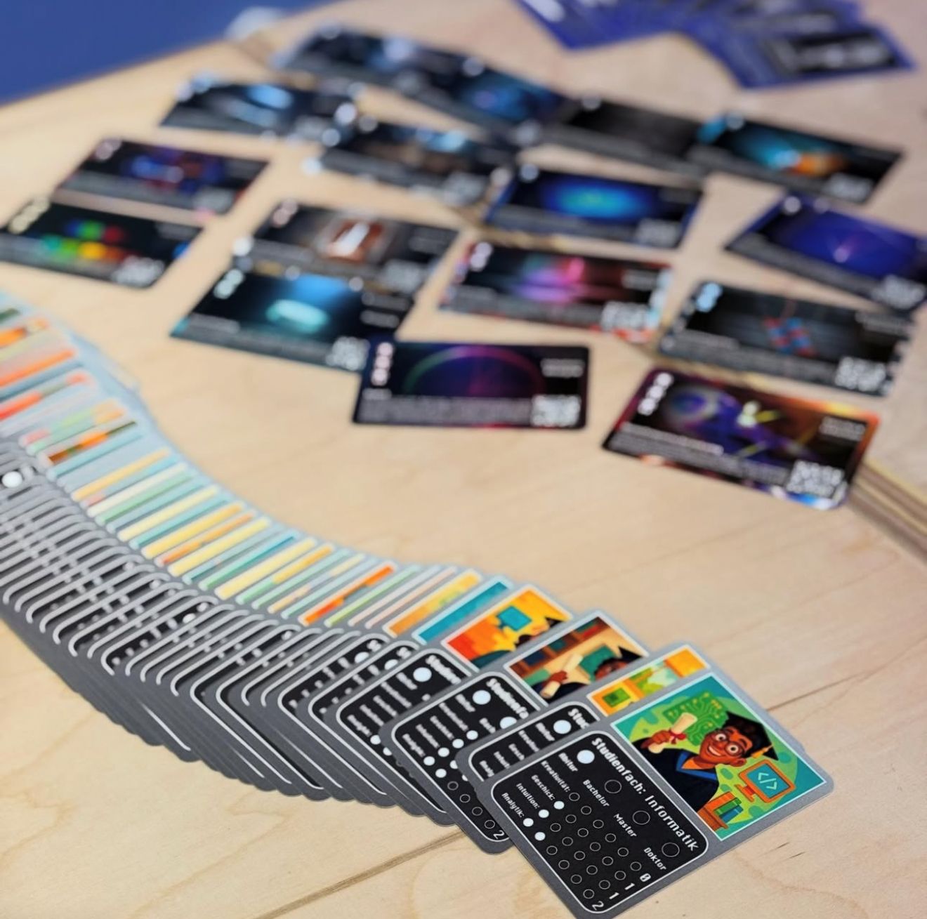 In the QUANTista card game , you take on the role of a researcher in the field of quantum physics. You and your research team want to develop new technologies – and beat the opposing research groups to it! Use the skills of your research team, but also cleverly employ sabotage tactics to win the technologies for yourself. Because whoever wins the technologies can collect research prizes. The player with the most research prizes wins the game! So, on your marks, get set, research!