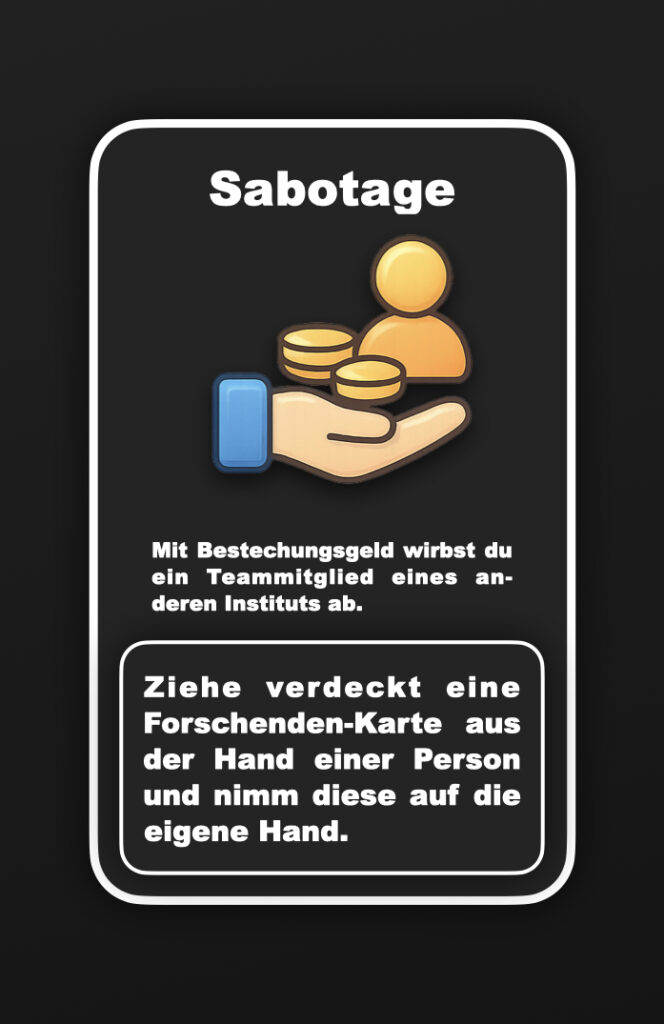Direkt nach dem Ausspielen der Karten darfst du eine Forschenden-Karte von der Hand einer beliebigen Person ziehen. Es muss eine Forschenden-Karte sein und darf keine Aktionskarte sein. Die Kartentypen erkennst du an der Farbe der Rückseite. Die gezogene Karte musst du aufnehmen, du darfst sie nicht zurück geben. Du darfst die Karte erst in der nächsten Runde ausspielen.